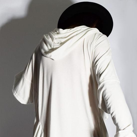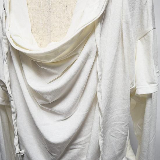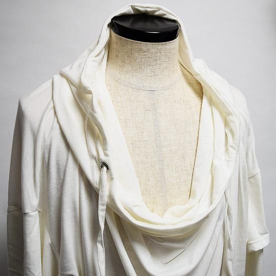 フードを施したドレープ調の変形ネックデザインを採用し、