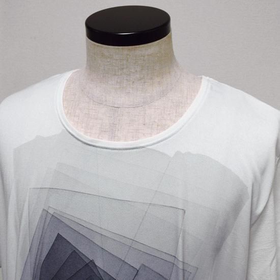 フロント部には、グラデーション調のスクエアプリントを多数重ねた幾何学調のデザインのビッグプリントが、