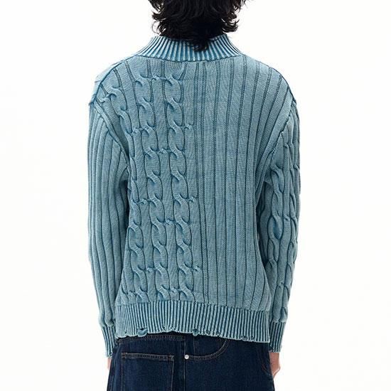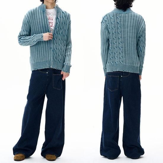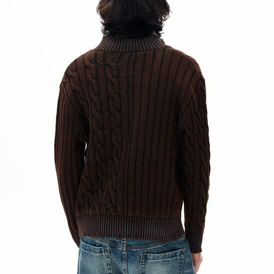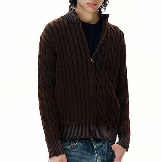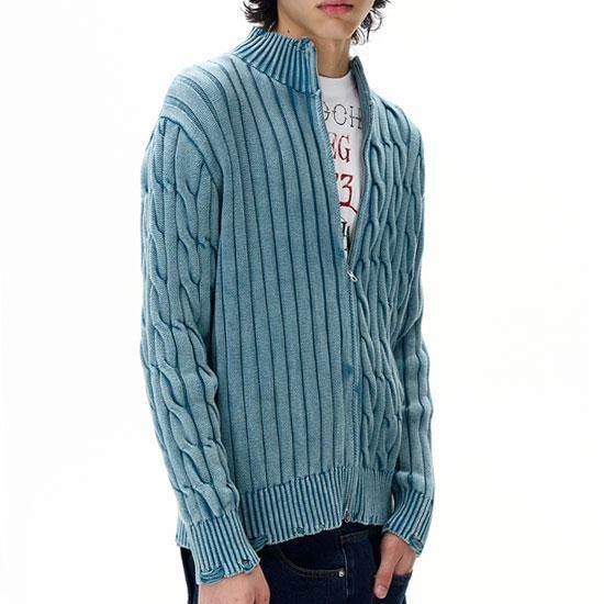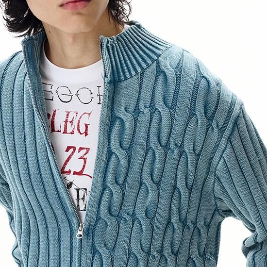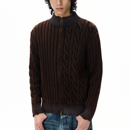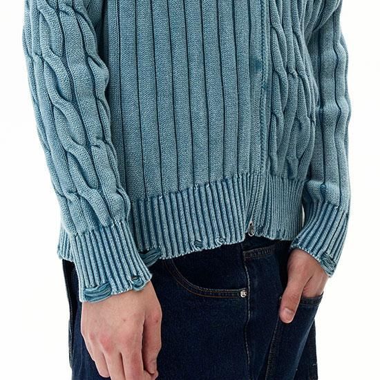 さりげないダメージ加工を施したジップアップニット。