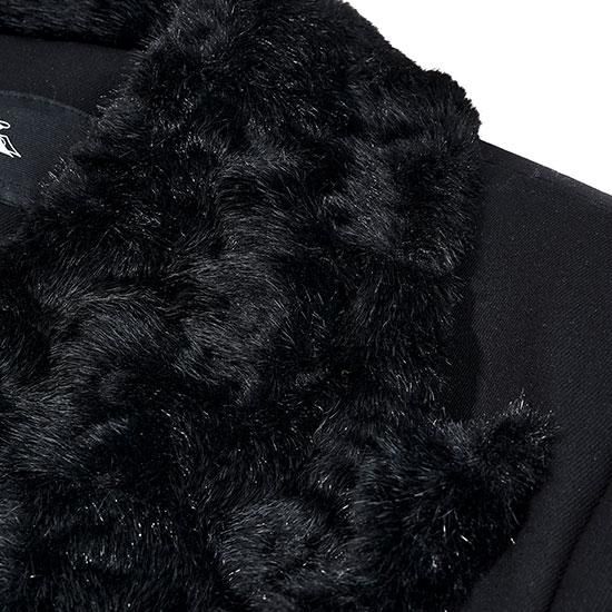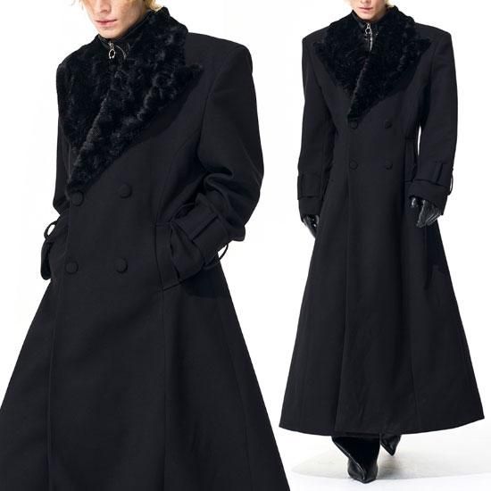 存在感抜群のファー切替デザインが印象的なロングコート。