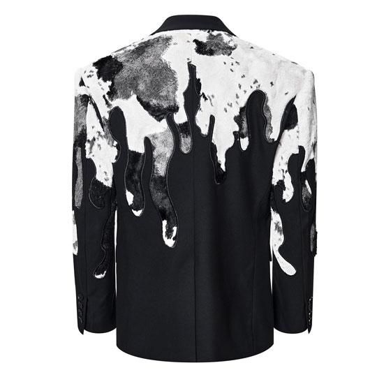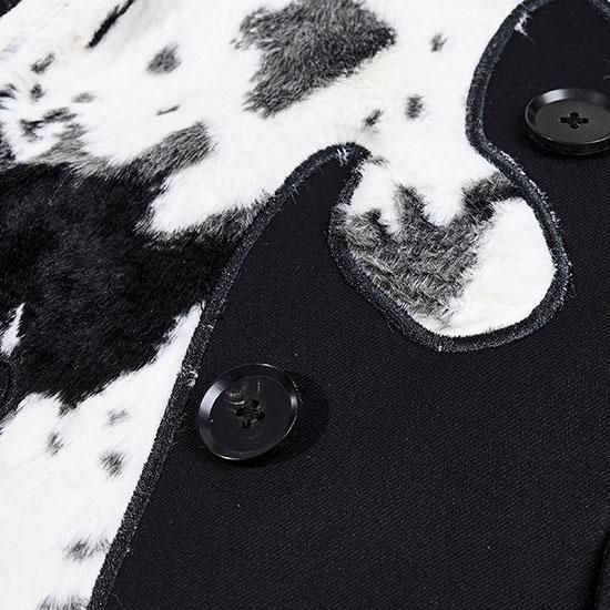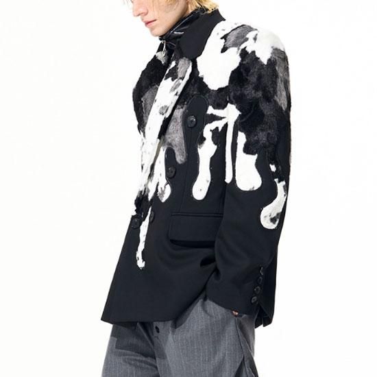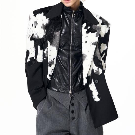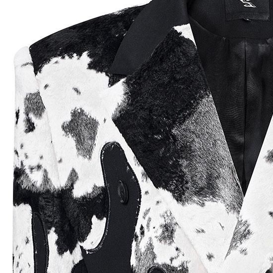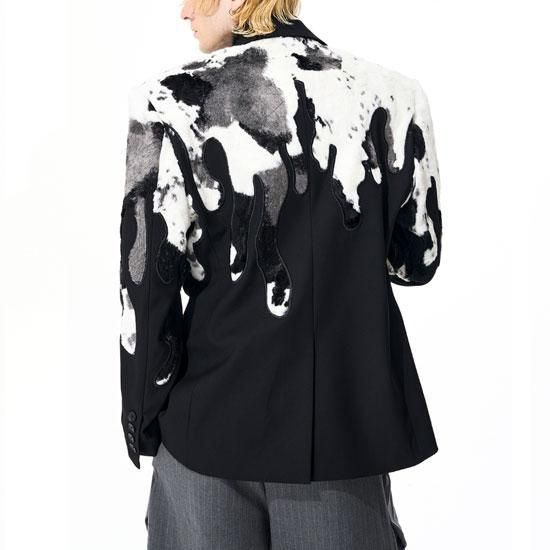 大胆な牛柄ファー切替が印象的なデザインジャケット。