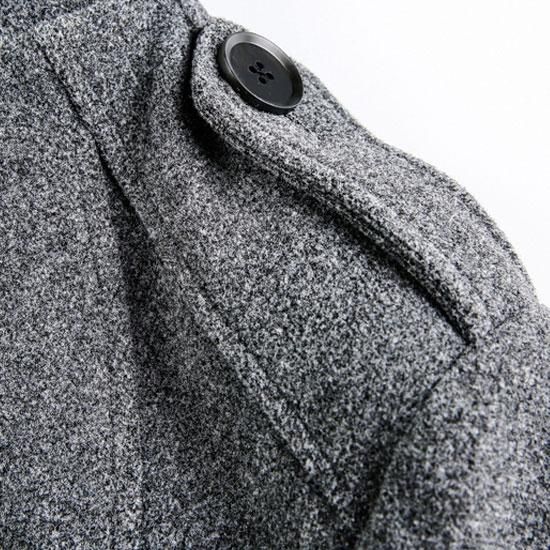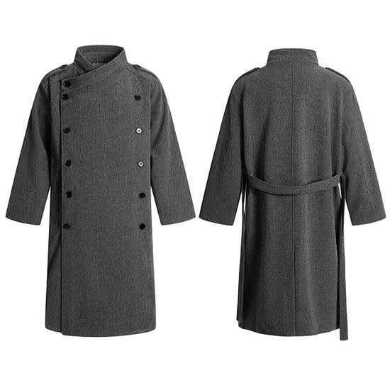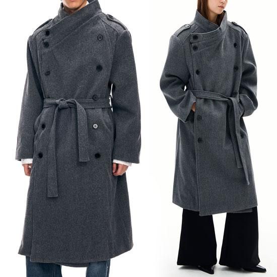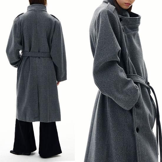 上品なウール混合生地を使用したハイネック仕様のローブコート。