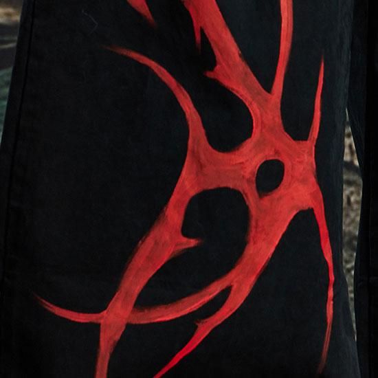 インパクト抜群のレッドペイントデザインが印象的なワイドパンツ。