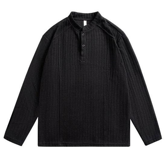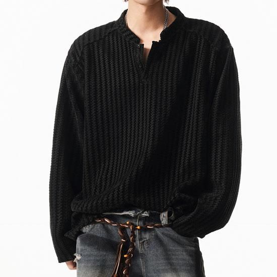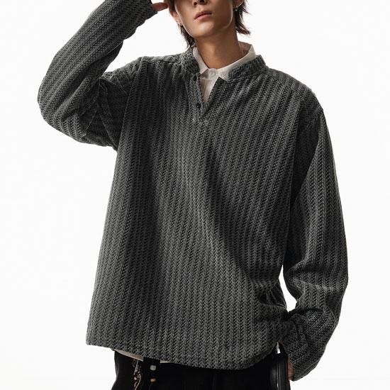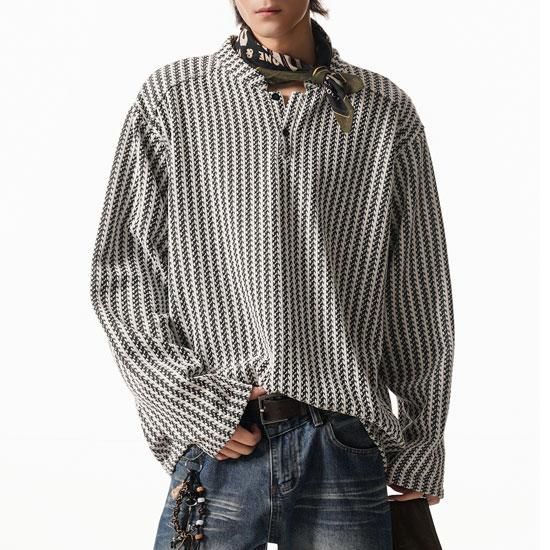 ストライプ×変形ヘンリーネックのロングTシャツ。